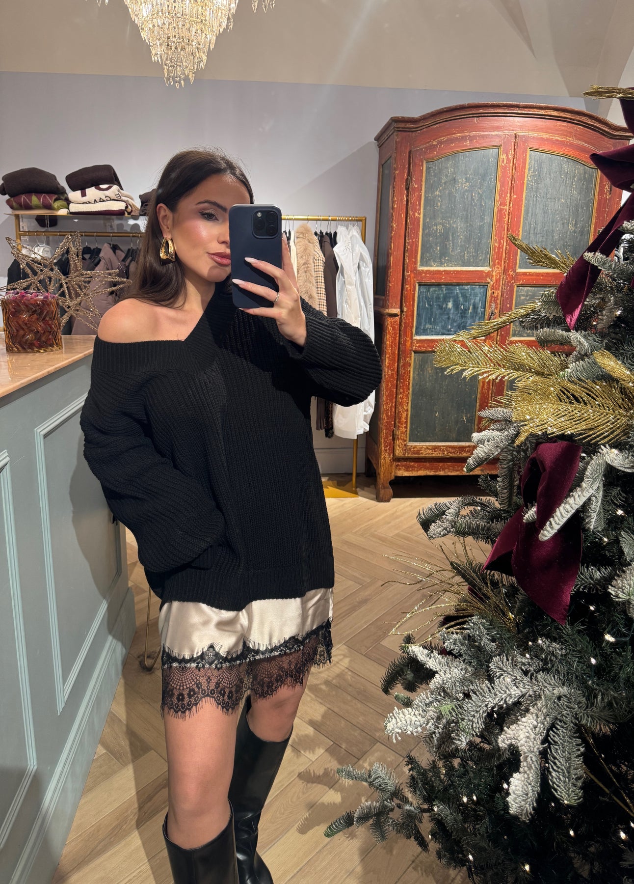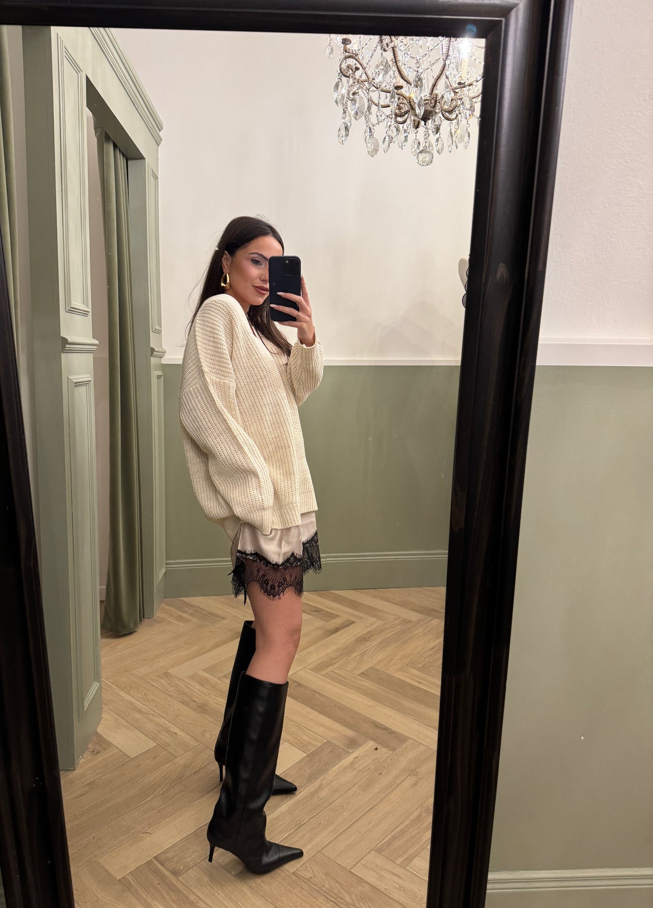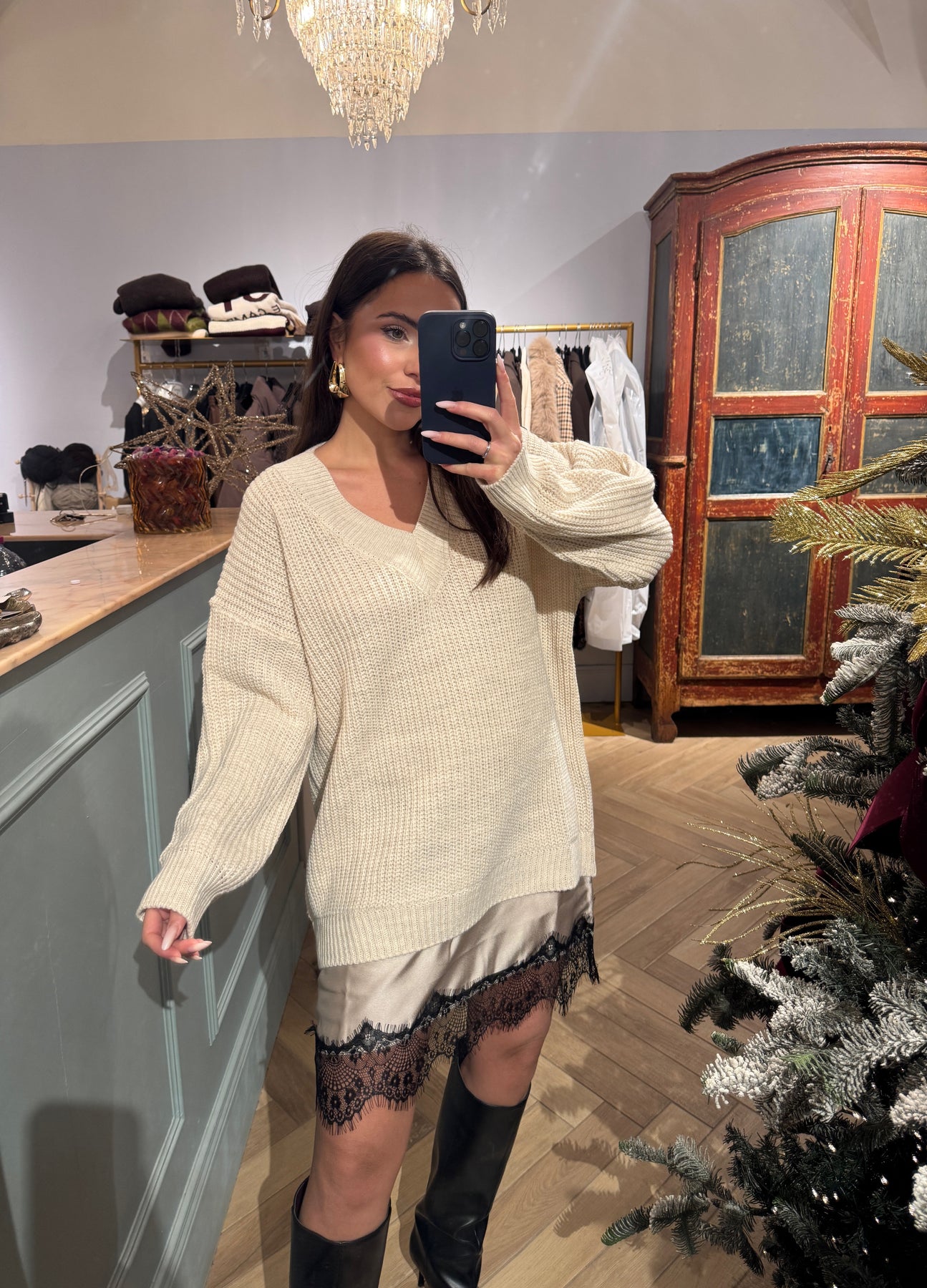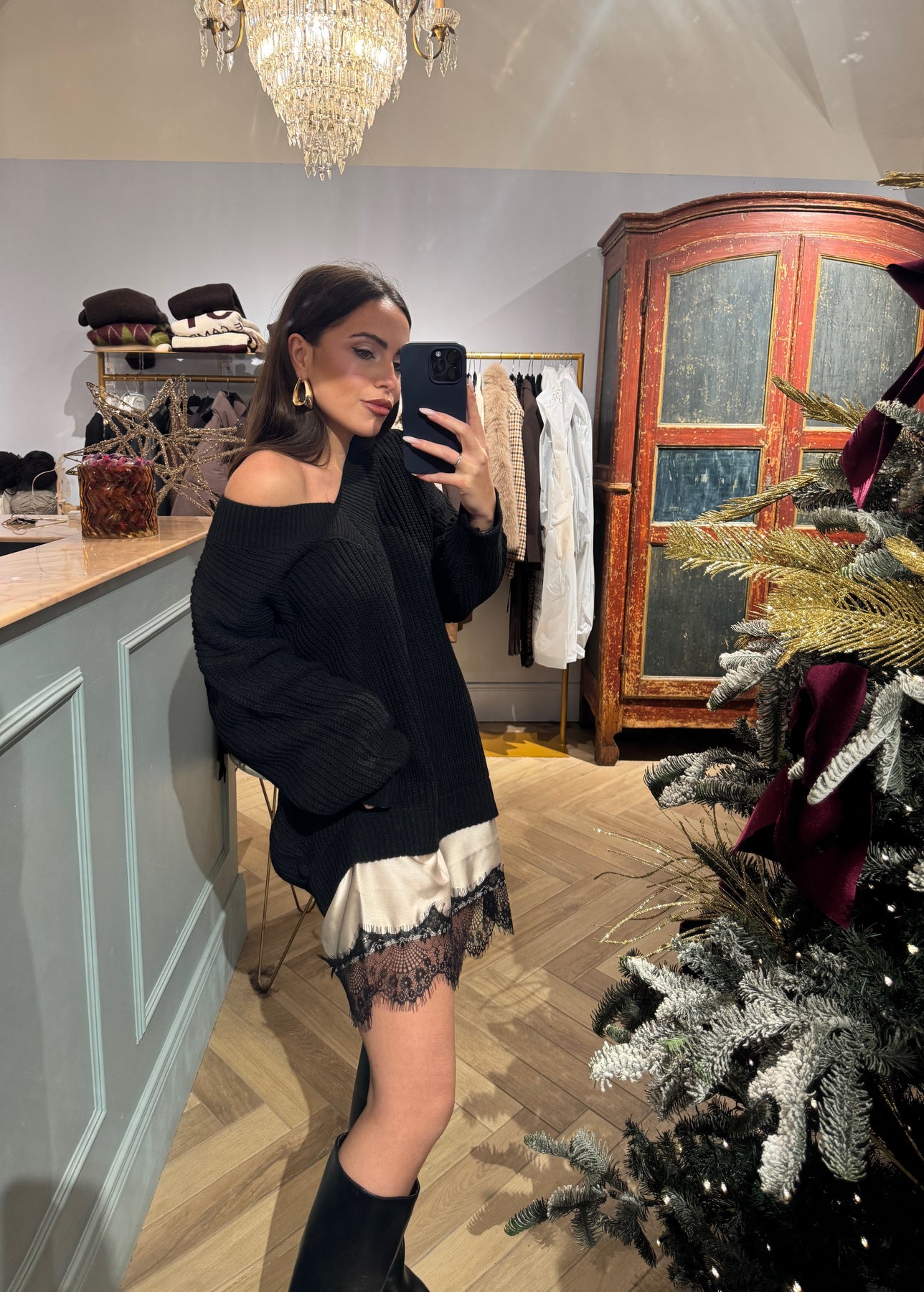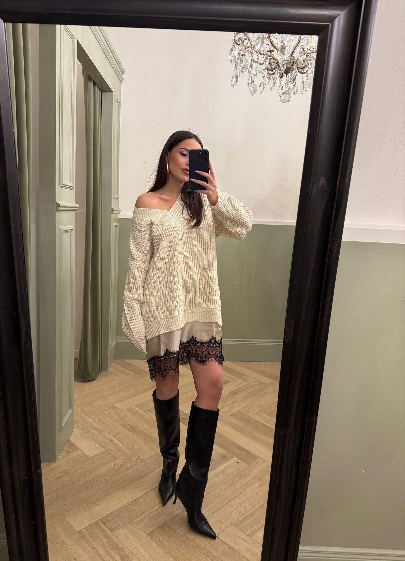 taglia unica, vestibilità over, la parte in pizzo è già integrata al maglione (pezzo unico )